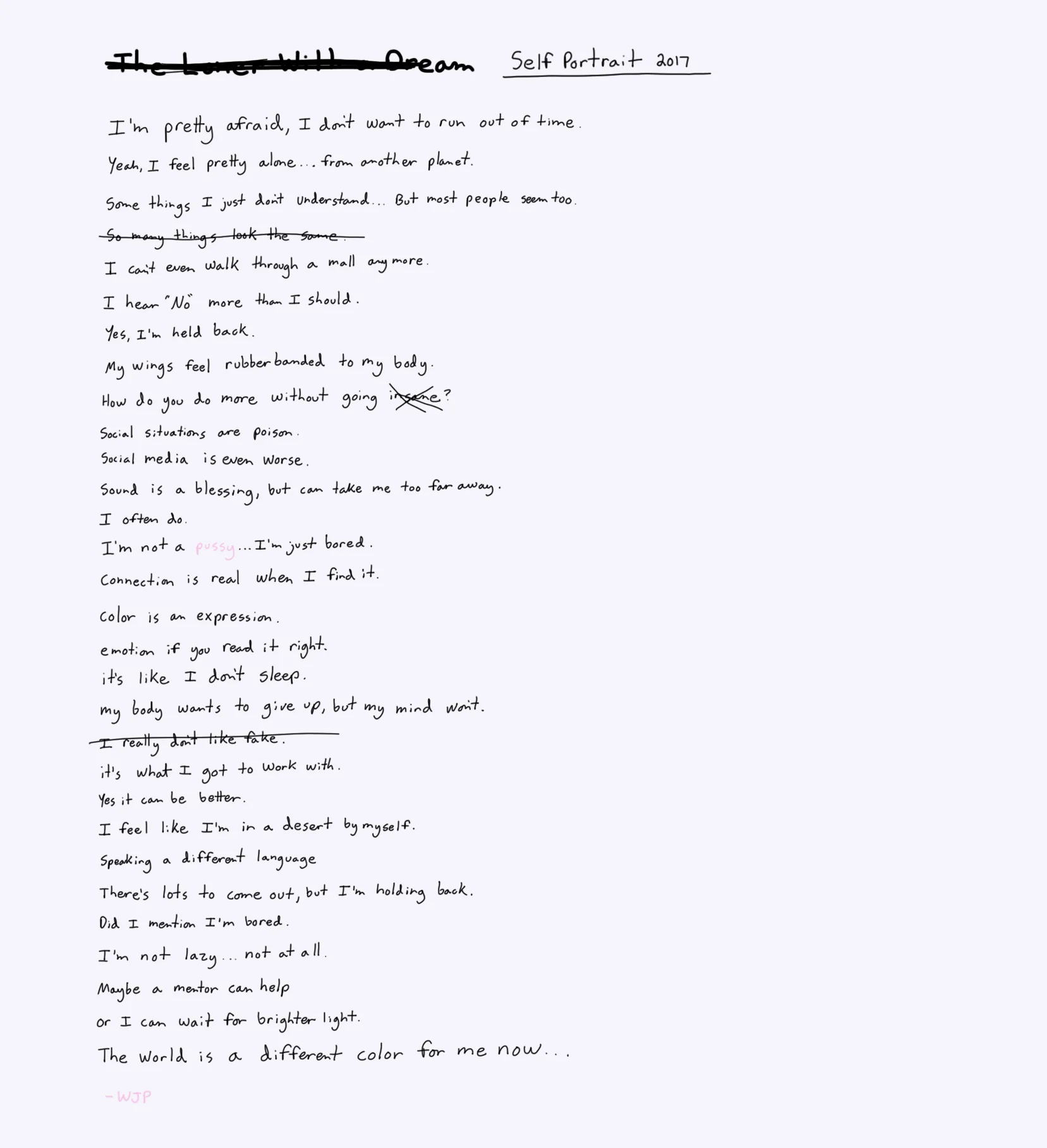 Much of WJP’s work focuses on a long-term study on identity and sometimes an abstraction of his own disposition. Through soft contrasting and hue manipulation, a somber photograph transports the viewer into an inviting idea and a nod to feeling different from the rest of society. It is essential a portrait of an outsider.